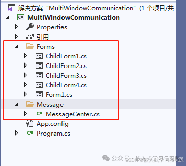 一、多窗口通信方式C#WinForms多窗口通信的方式有:构造函数传递属性传递接口事件通信委托回调静态消息中心二、示例代码C#WinForms中多窗口之间各种通信方式的示例。示例包含一个主窗口和多个子窗口,测试开发中常用的几种通信方式。项目结构如下:2.1MessageCenter.cs代码usingSystem;us...