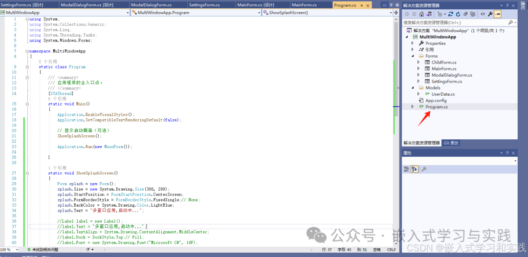 测试用例WinForms多窗口应用示例,包含主窗口、子窗口、模态窗口和非模态窗口的创建和管理。1.项目结构和基础类项目文件结构MultiWindowApp/├──Forms/│├──MainForm.cs│├──ChildForm.cs│├──ModalDialogForm.cs│└──SettingsForm.cs├...