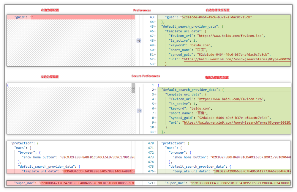 篡改后的浏览器配置(源:火绒安全) 二、恶意模块专门锁定主流浏览器 火绒安全监测发现,该恶意推广模块会首先检测用户设备上的杀毒软件(尤其是360安全和火绒安全),随后通过篡改配置文件的方式,强制修改Edge与Chrome两款主流浏览器的主页及默认搜索引擎设置 。具体而言,恶意模块会修改浏览器的Preferences、Secure Preferences、Bookmarks等关键配置文件,实现对用户浏览习惯的强制干预。