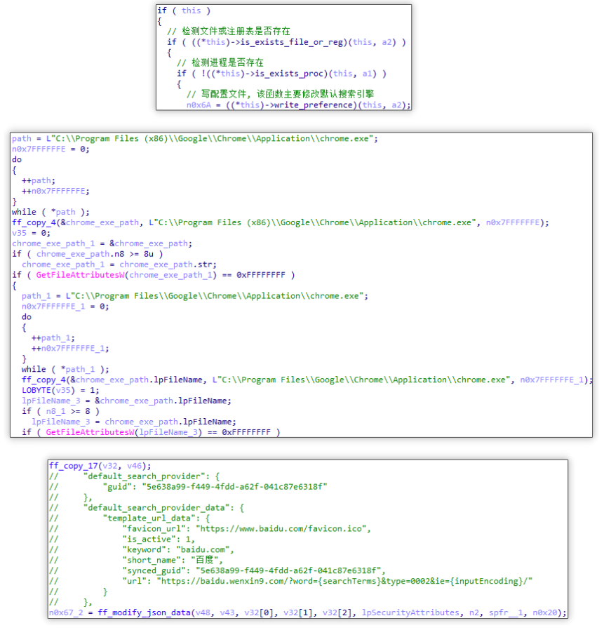 通过写入 Preferences 与 Secure Preferences 配置文件的方式将 template_url_data 中 url 设置为 https://baidu.wenxin9.com/?word={searchTerms}&type=0002&ie={inputEncoding}。之后用户再次搜索内容时先跳转到 https://baidu.wenxin9.com/?word=搜索内容&type=0002&ie=UTF-8,最终跳转至 www.baidu.com/s?tn=75144485_10_dg这类带有来源标识的链接并从中获利。