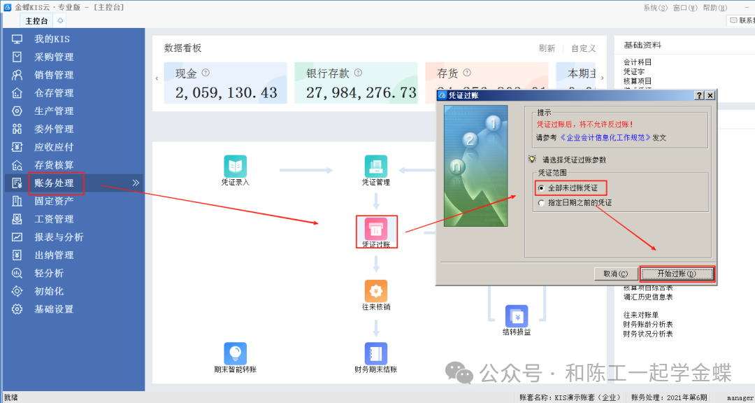 仓存与总账对账中的总账数据取自已过账的存货科目数据。检查总账是否有未过账的存货科目凭证,为了方便起见,我们可以将账务处理中的凭证全部过账。