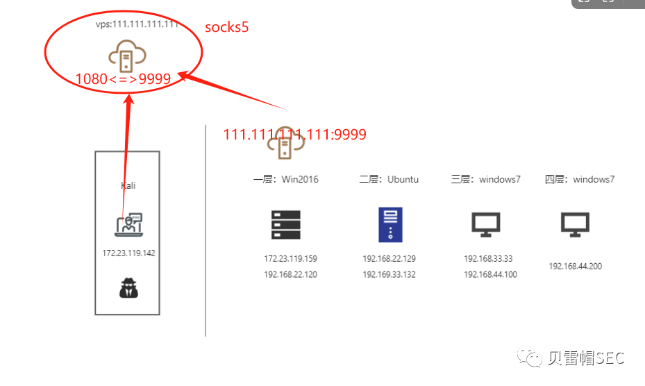 1、VPS 使用iox 监听9999端口和1080端口,第一个端口用来接受边界主机流量,第二个端口则是将流量转发给本地1080。