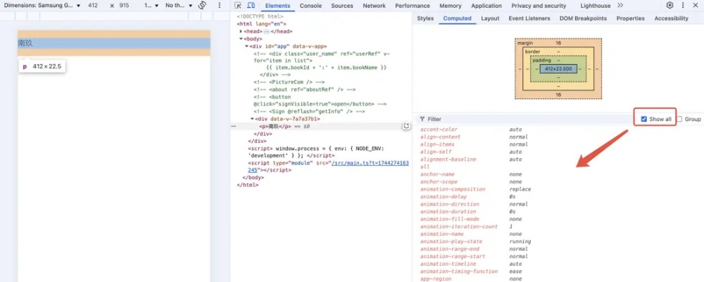 打开浏览器控制台,选中元素,切换到computed选项,勾选show all,这里就能够看到元素的所有CSS样式。