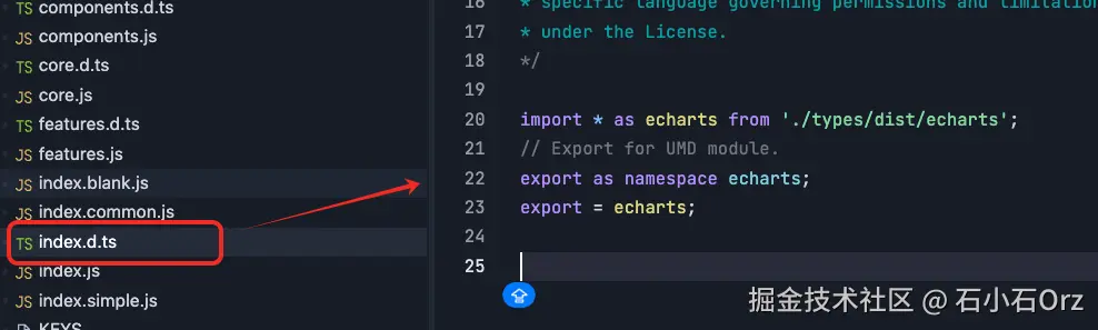 这是为了兼容 UMD 模块,即在浏览器通过 <script> 直接引入时,可以挂载到全局变量 window.echarts 上。这样我们在代码里就能直接写: