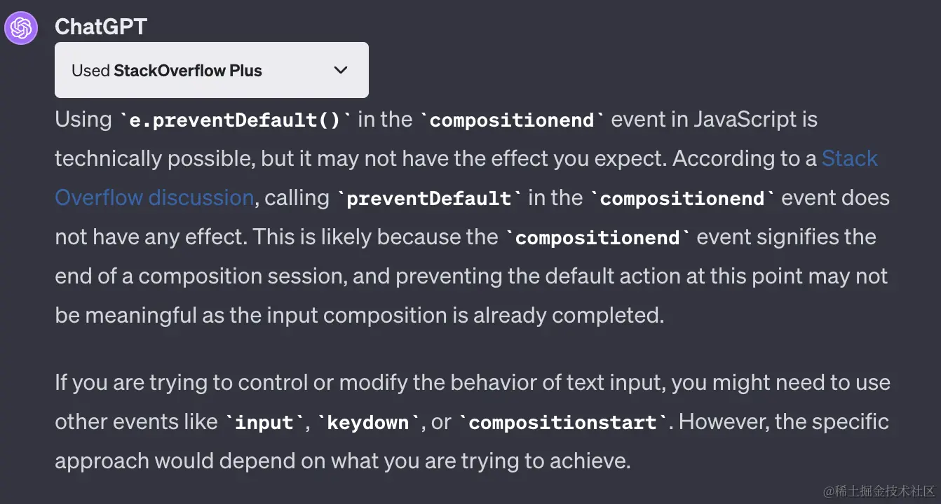 上面大概的意思就是compositionend事件里使用 e.preventDefault() 在技术上可行的,但它可能不会产生你期望的效果。可能是因为 compositionend 事件标志着一次输入构成(composition)会话的结束,而在这个点上阻止默认行为可能没有意义,因为输入的流程已经完成了。
