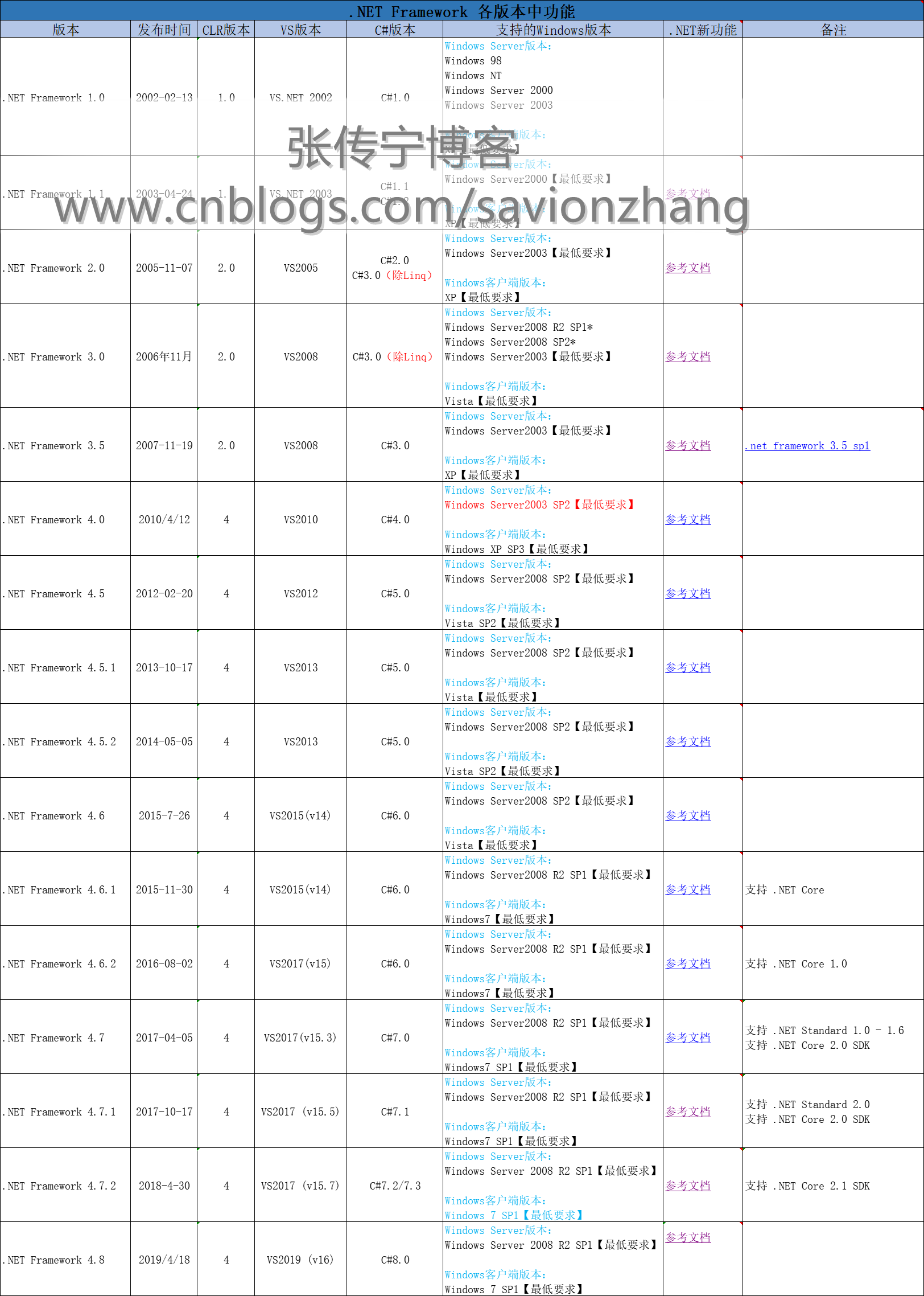 .NET Framework 从1.0发展到4.8版本,由于每个版本的功能设计与发行目标不同,运行时、开发工具、编程语言、支持的Windows版本等有不同的差异,下表列出了详细的对比信息。