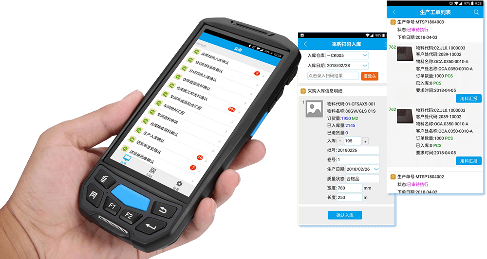 通过扫码进行采购入库,零耗时,来料信息实时上传后台,库存即时生成;